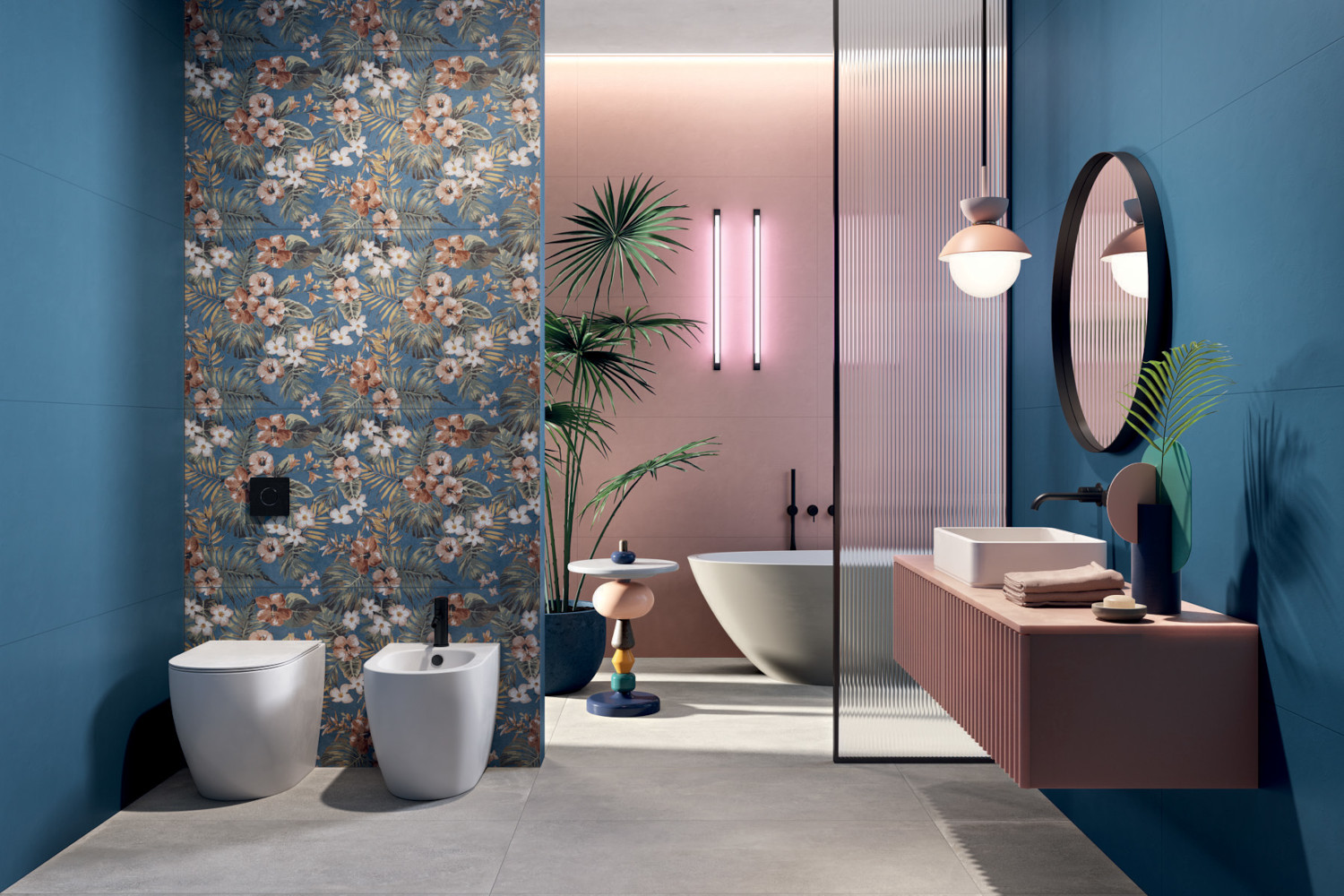 Medtem ko naravni odtenki ploščic, kot so bež, siva in bela, ostajajo brezčasna izbira, sodobne kopalnice pogosto vključujejo tudi drznejše barvne kombinacije. Preplet temnih in svetlih tonov, kot sta modra in rožnata ter kombinacija zelenih odtenkov s ploščicami v imitaciji lesa ali teraco vzorci, prostoru doda edinstven značaj. Ploščice z nežnimi geometrijskimi vzorci in teksturami pa še dodatno obogatijo vizualni učinek.