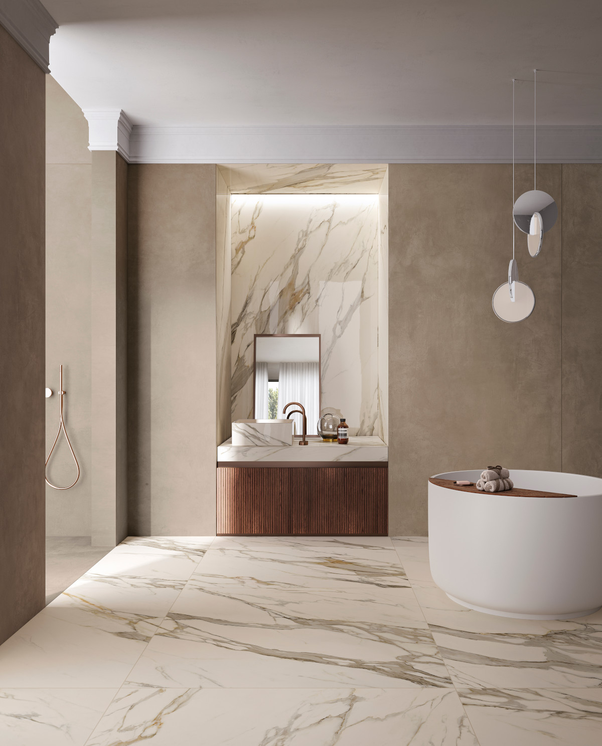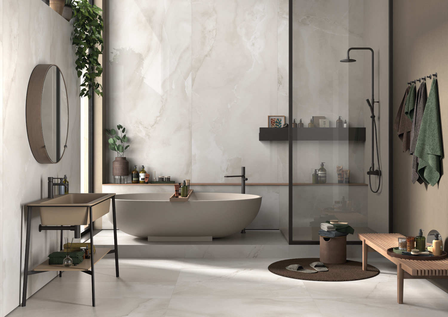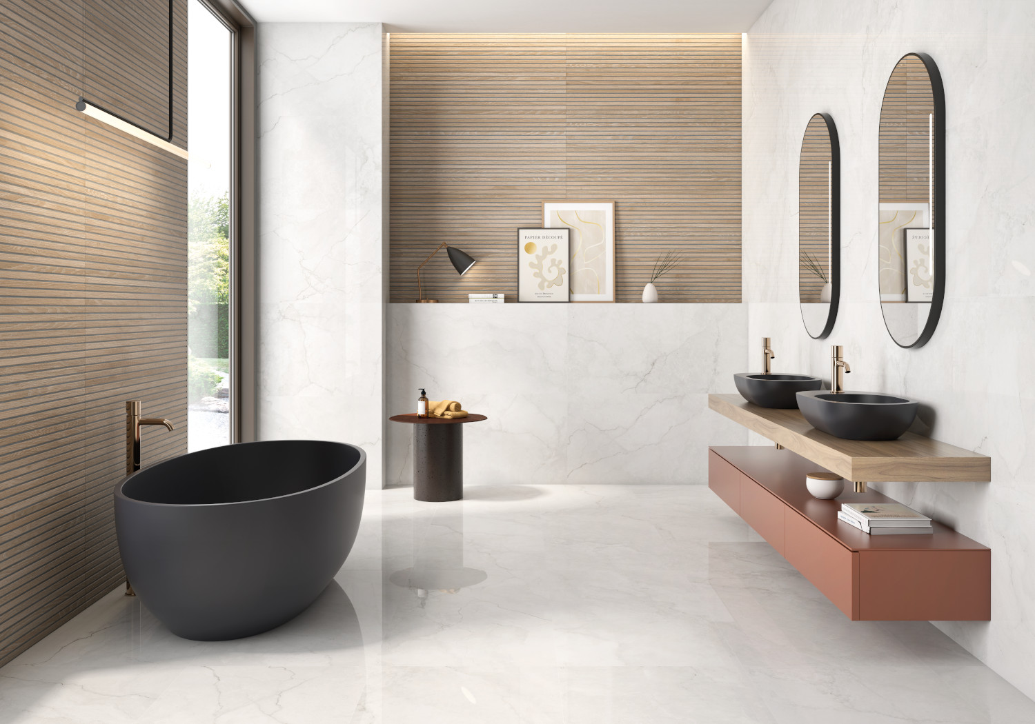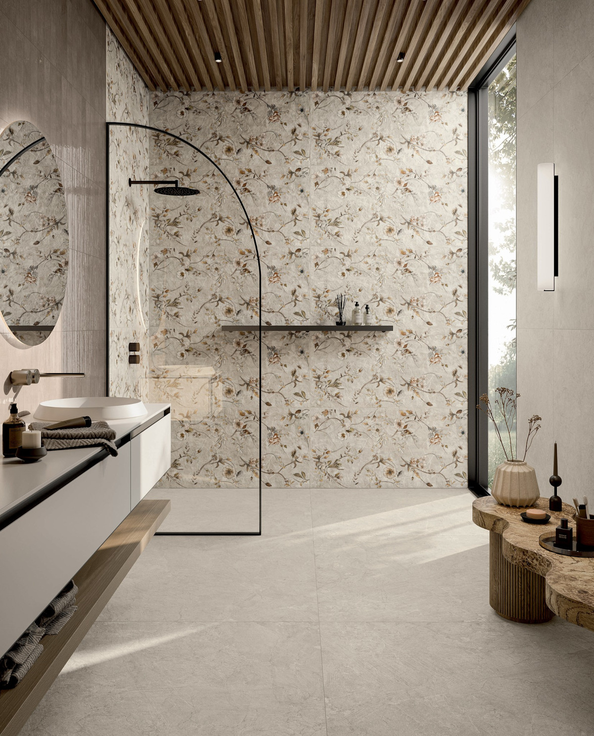 V sodobnih kopalnicah prevladuje trend vračanja k naravnim materialom, saj le-ti prostoru dodajo občutek topline in prestiža. Ploščice z videzom lesa, kamna ali marmorja prostoru dodajo pridih ekskluzivnosti, hkrati pa zagotavljajo vzdržljivost in enostavno čiščenje. Kombinacija mat površin in nežnih barvnih prehodov ustvari sofisticiran in pomirjujoč končni videz.