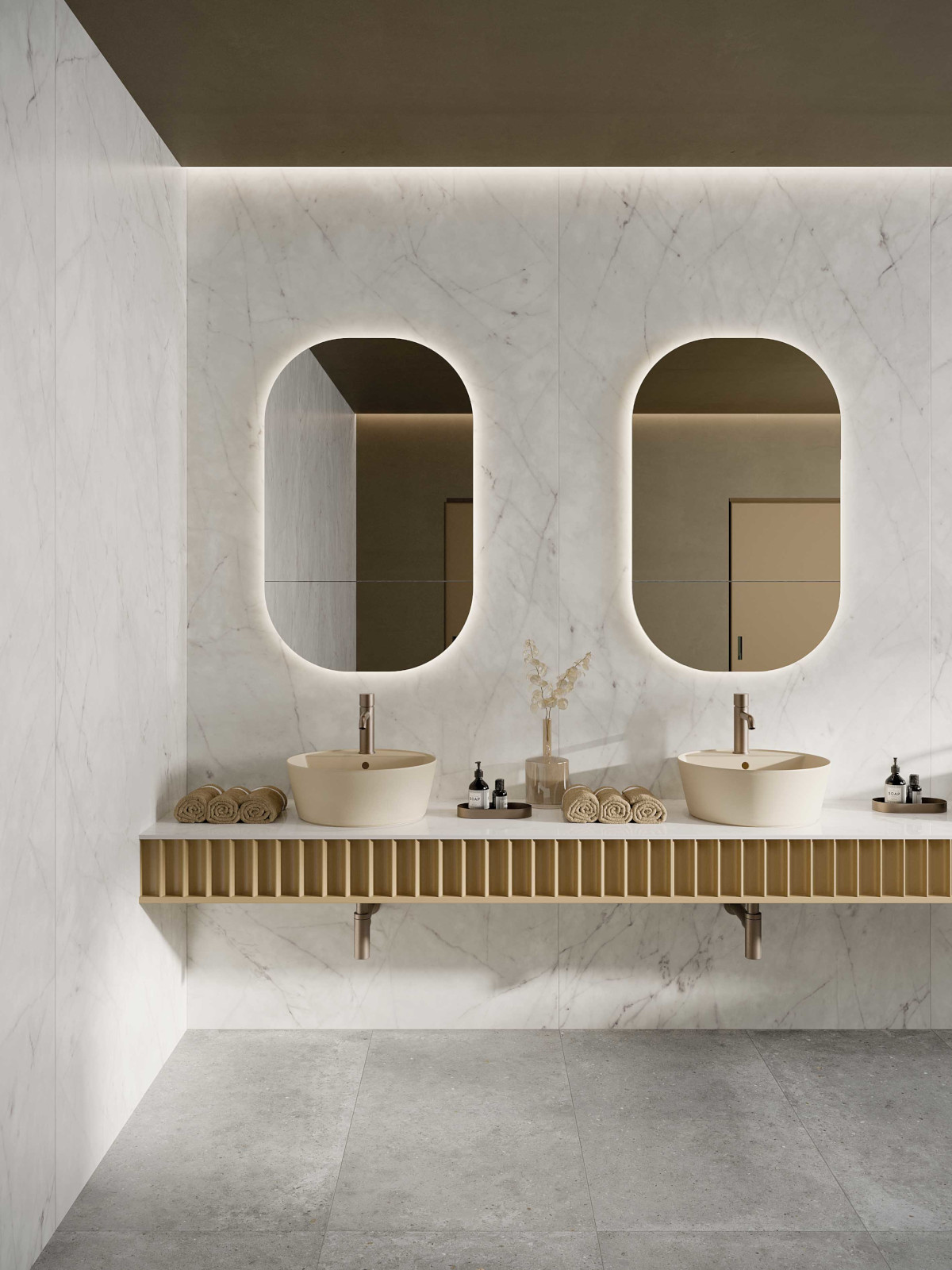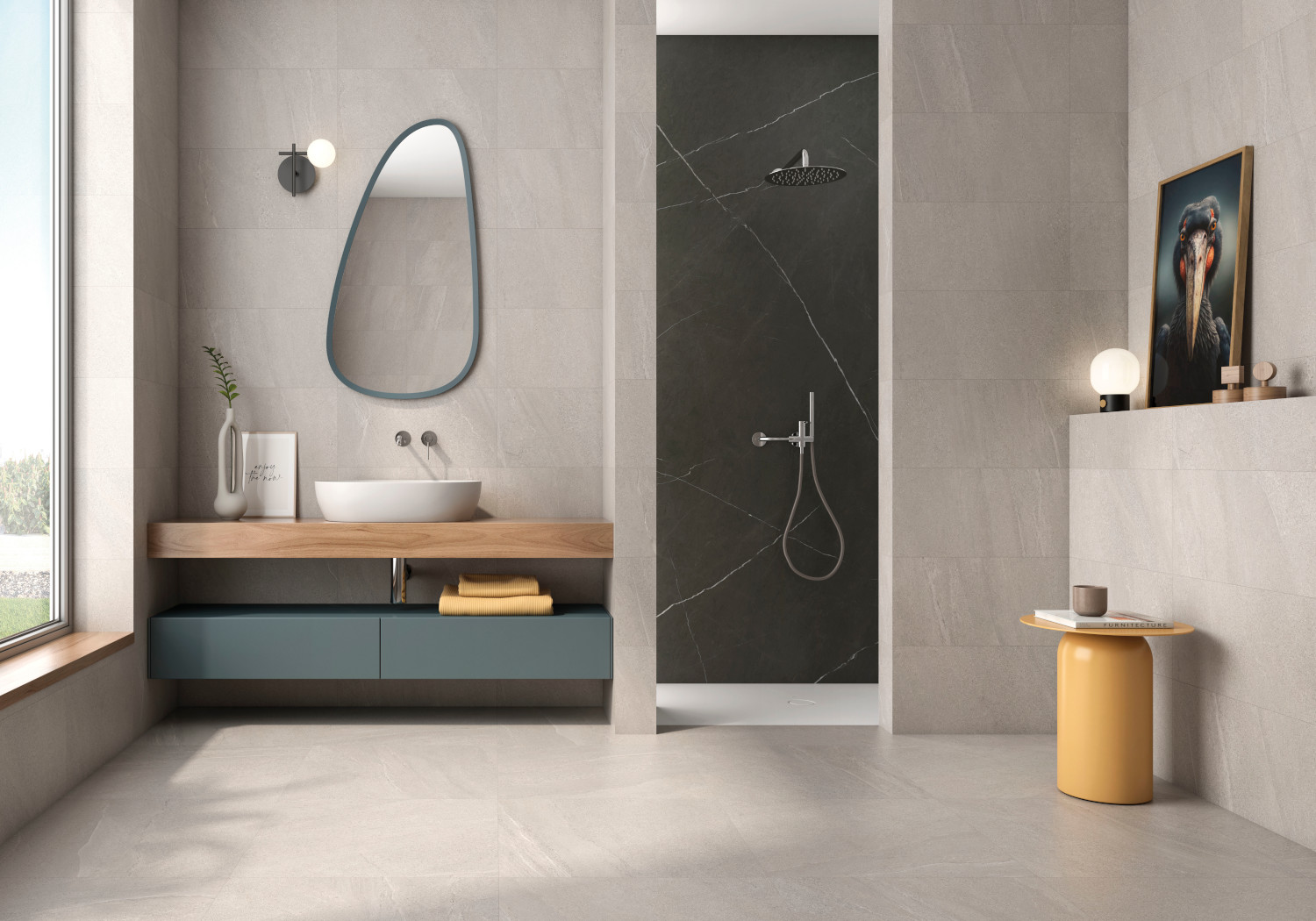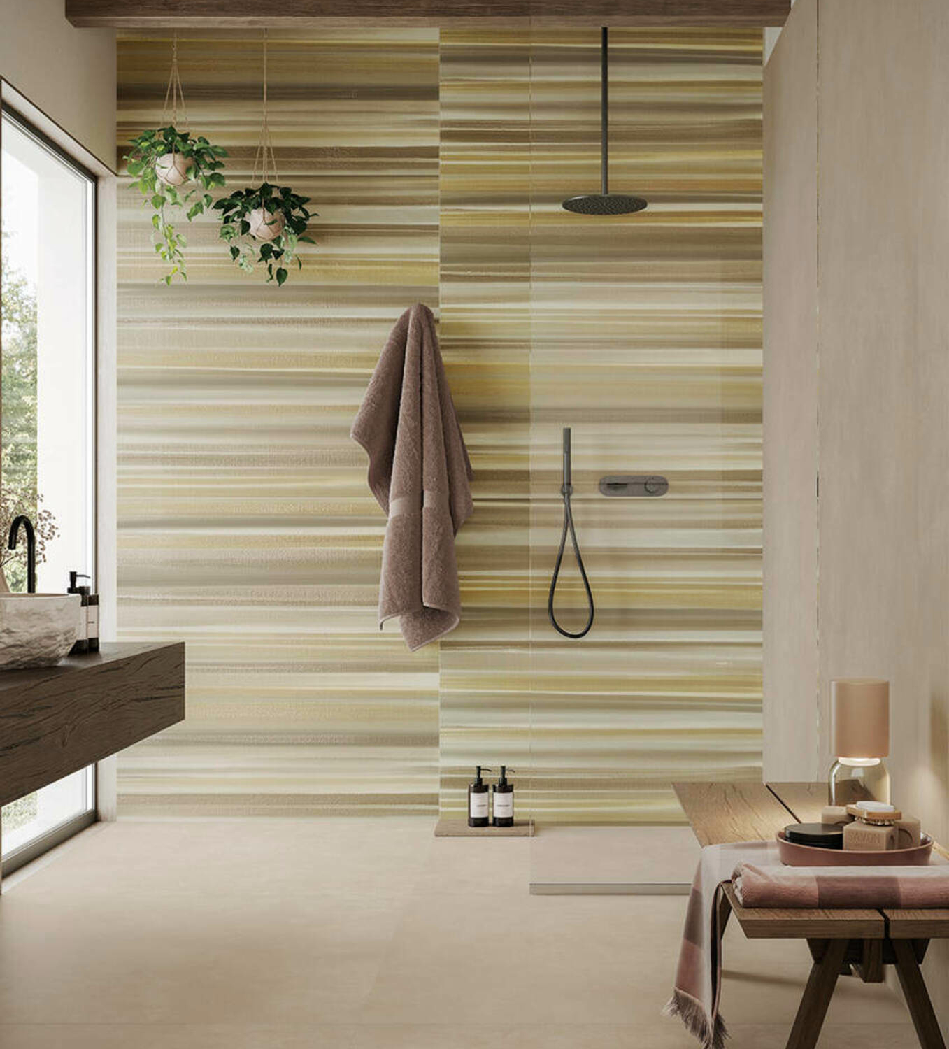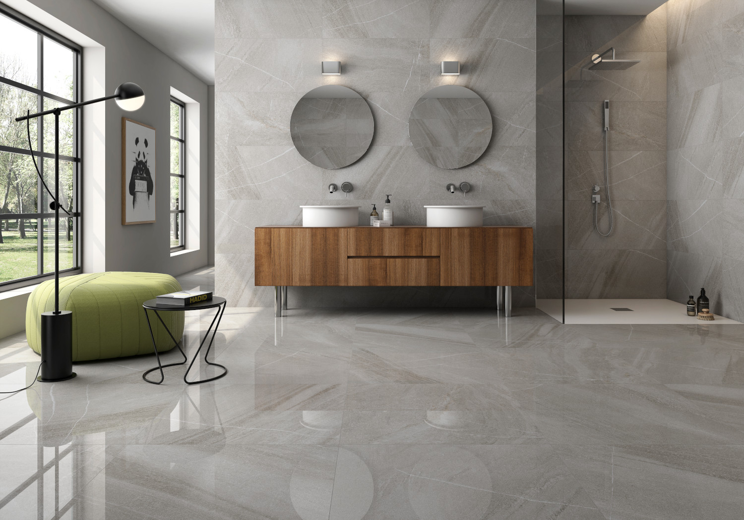 V sodobnih kopalnicah prevladuje trend vračanja k naravnim materialom, saj le-ti prostoru dodajo občutek topline in prestiža. Ploščice z videzom lesa, kamna ali marmorja prostoru dodajo pridih ekskluzivnosti, hkrati pa zagotavljajo vzdržljivost in enostavno čiščenje. Kombinacija mat površin in nežnih barvnih prehodov ustvari sofisticiran in pomirjujoč končni videz.