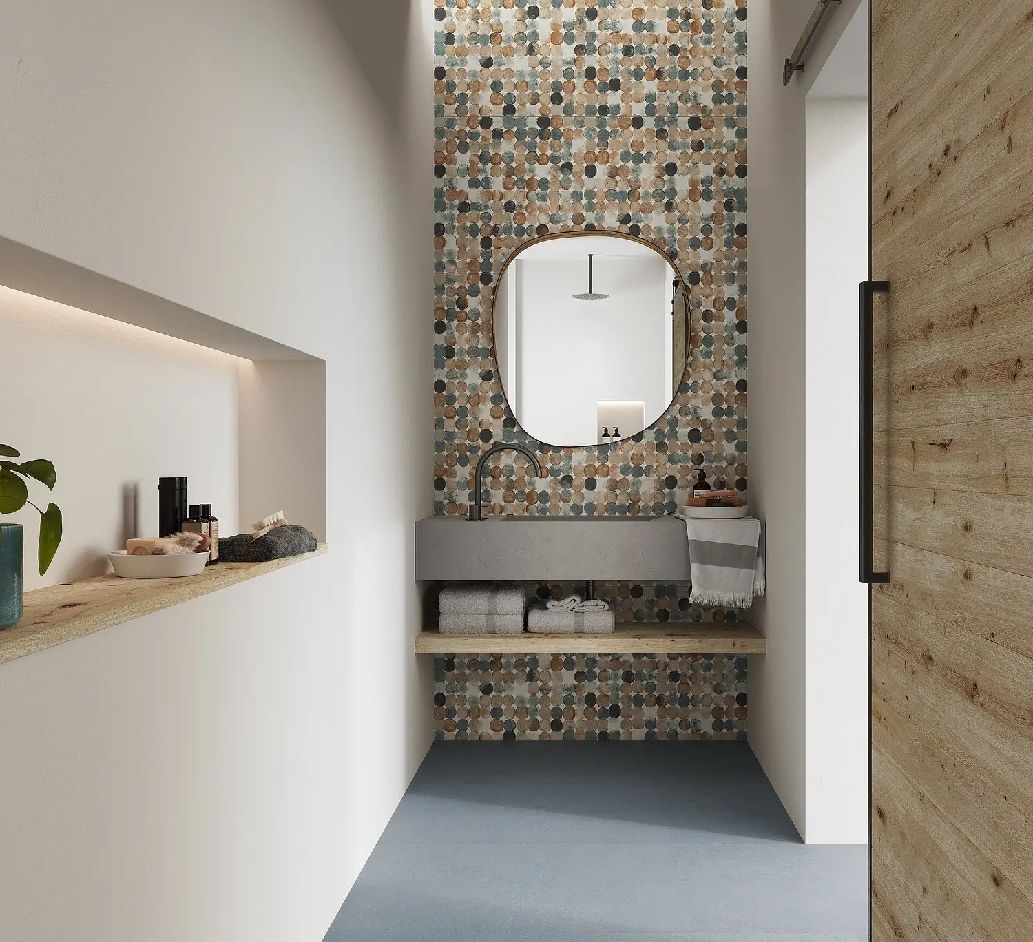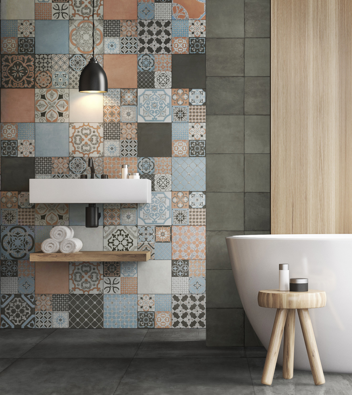 Monotonost ploščic lahko obogatimo s premišljeno uporabo različnih vzorcev in tekstur. Tridimenzionalne ploščice ali ploščice z močnimi grafičnimi motivi so odlična izbira za ustvarjanje dinamičnih točk fokusa bodisi na steni za ogledalom, v tuš kabini ali ob kadi. Da prostor ne deluje prenasičeno, jih kombinirajte z nevtralnimi površinami v podobnih barvnih odtenkih.