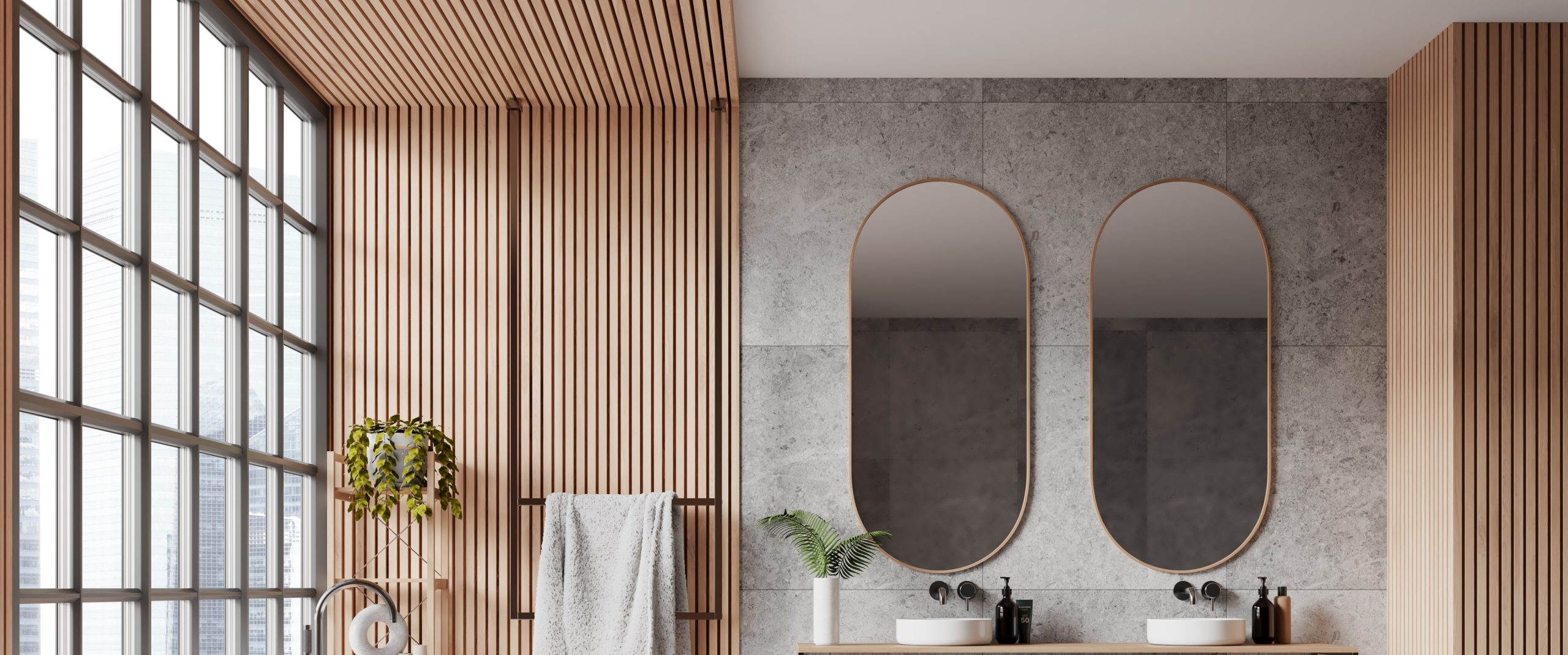 Leseni stropi v kopalnico vnašajo toplino in naravni pridih, ki izvrstno dopolnjuje hladne materiale, kot sta keramika in steklo. Če že imate prostor z lesenim stropom, zakaj ga ne bi izpostavili kot osrednji element? Poudarite njegovo lepoto in ustvarite občutek domačnosti v kopalnici. V nasprotnem primeru pa lahko eksperimentirate z različnimi lesenimi elementi, kot so akustični paneli, ki obogatijo estetski videz in zmanjšujejo odmev, za mirnejše in prijetnejše vzdušje. Izberite panele, primerne za vlažne prostore, da zagotovite njihovo trajnost in učinkovitost.