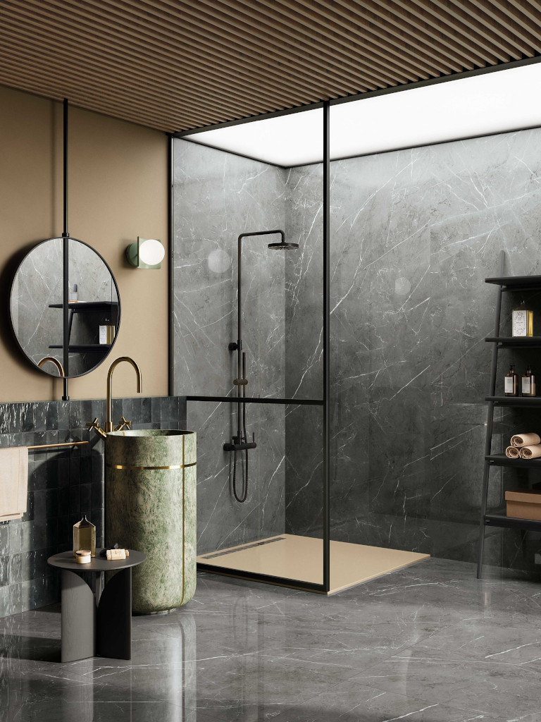 Optična iluzija: Svetlejši strop lahko manjšo kopalnico naredi bolj zračno, medtem ko temnejši odtenki prostoru dodajo globino in intimo.
