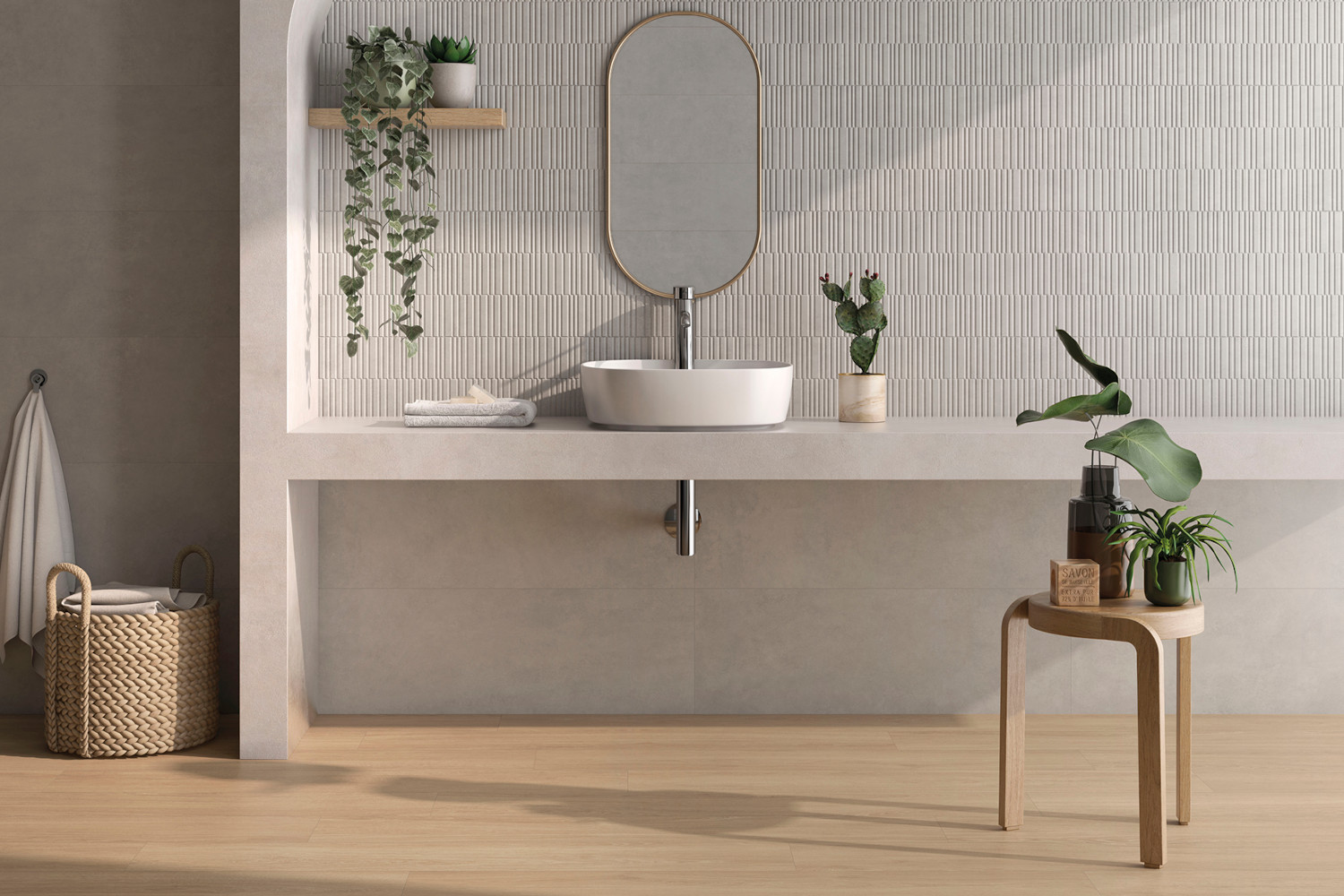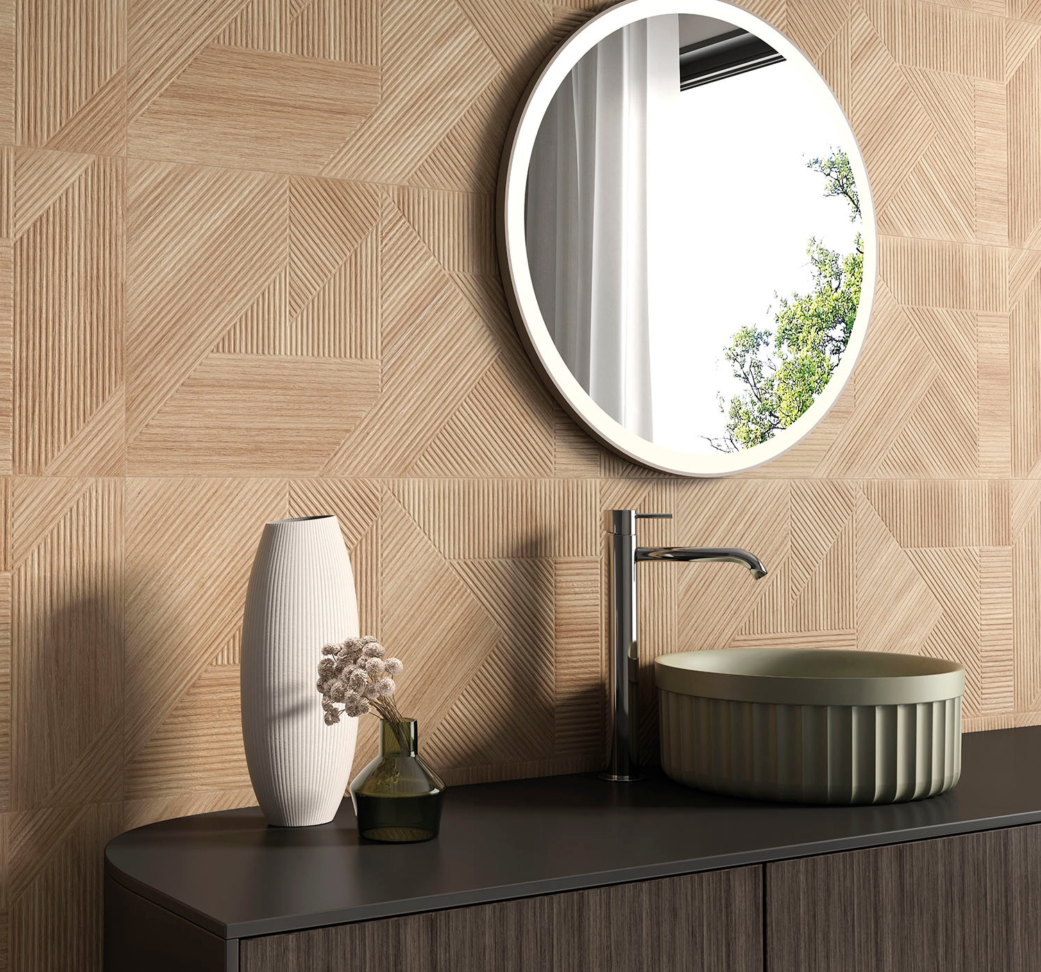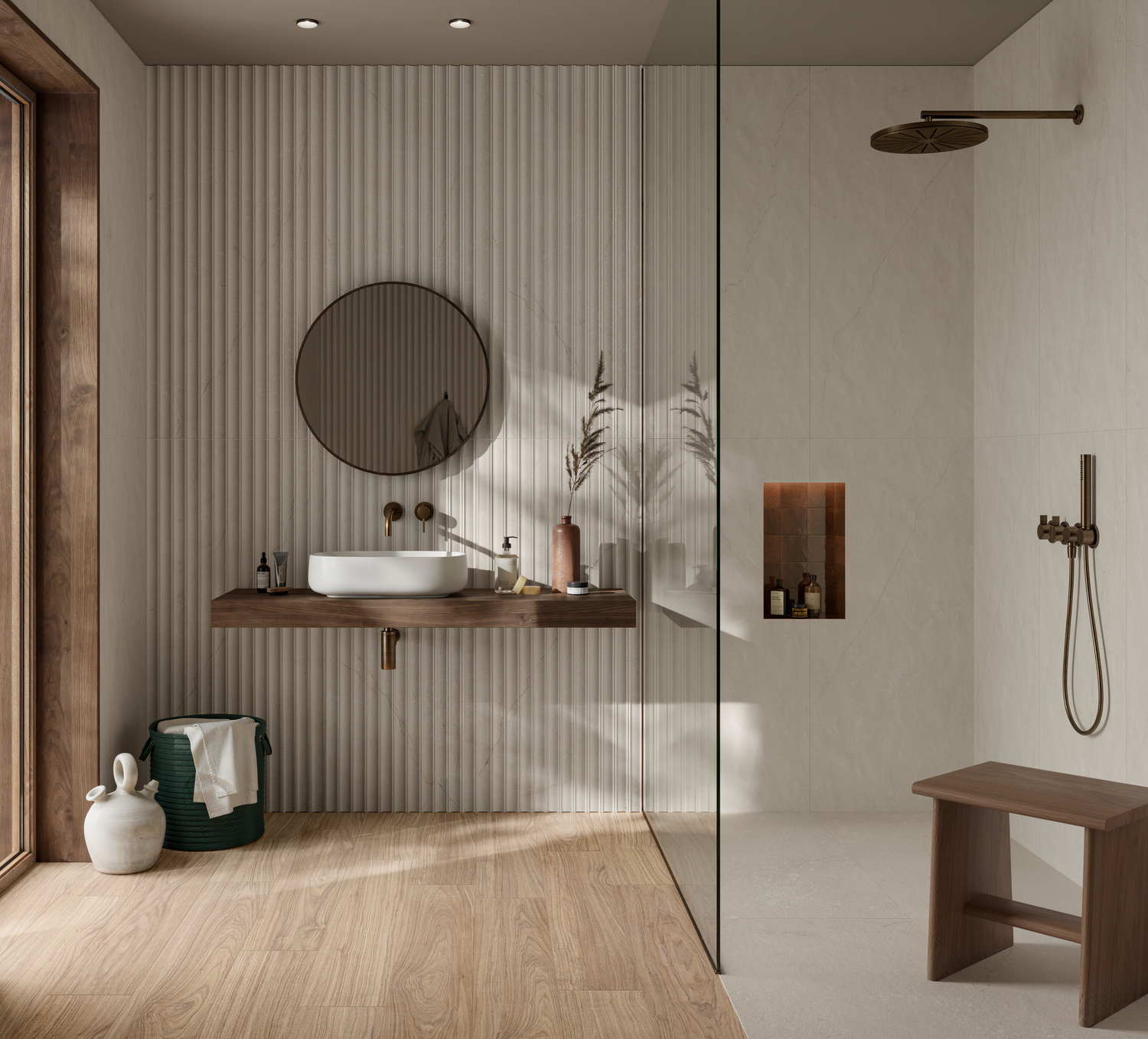 Letos je izrazit poudarek na tridimenzionalnosti. Površine niso več gladke, prevladujejo rebraste, žlebaste in valovite strukture, ki dajejo stenam globino in dinamiko. Svetloba na teh reliefih ustvarja igro senc in poudarkov, zato ploščice postajajo skoraj umetniški element prostora.