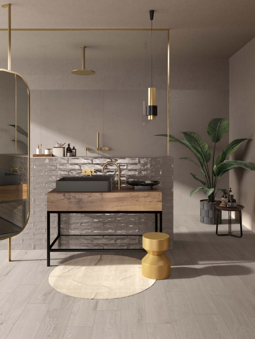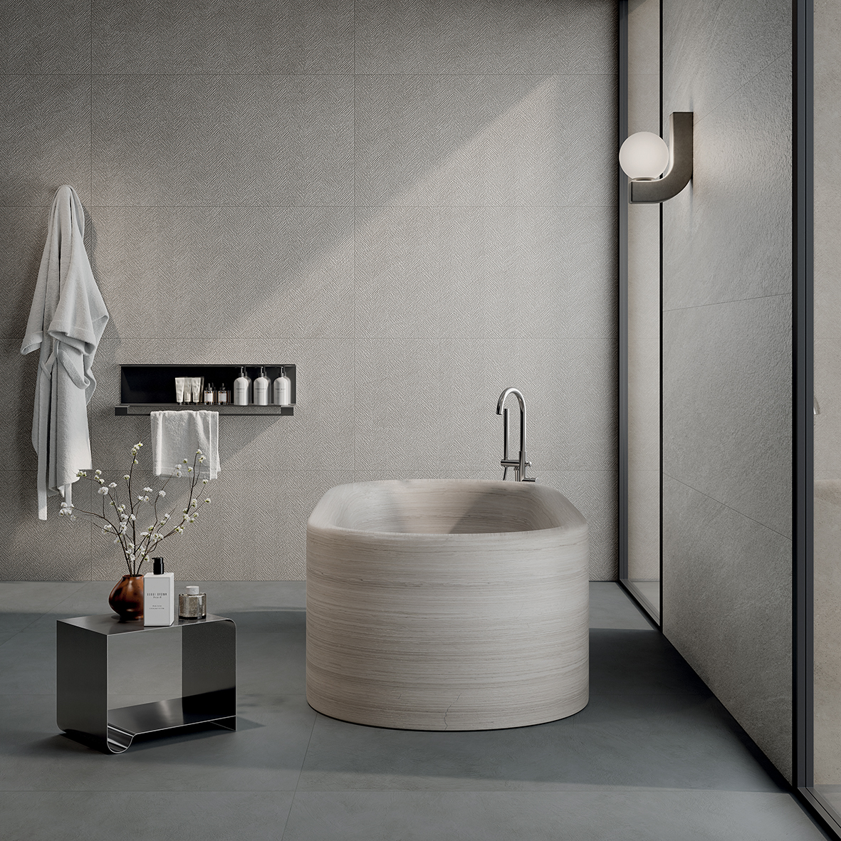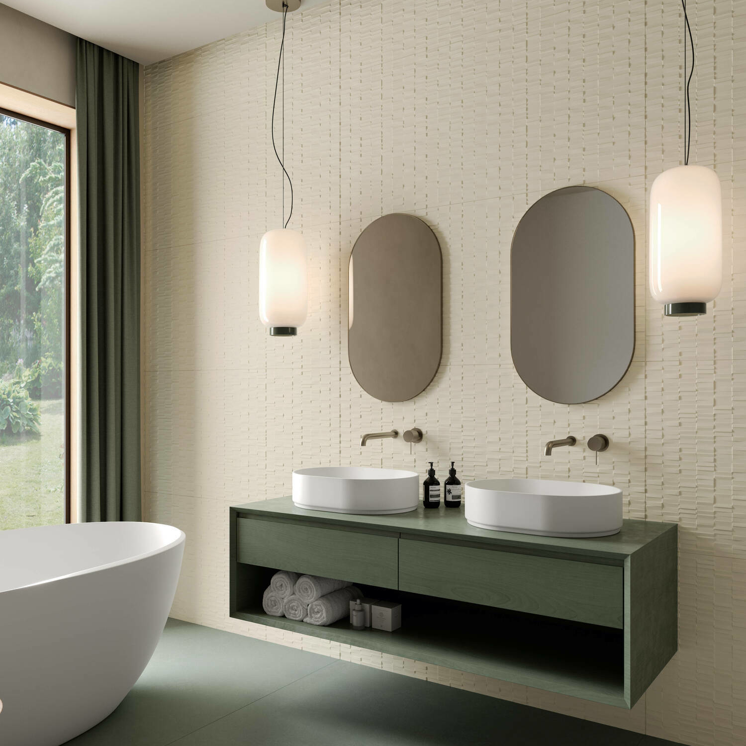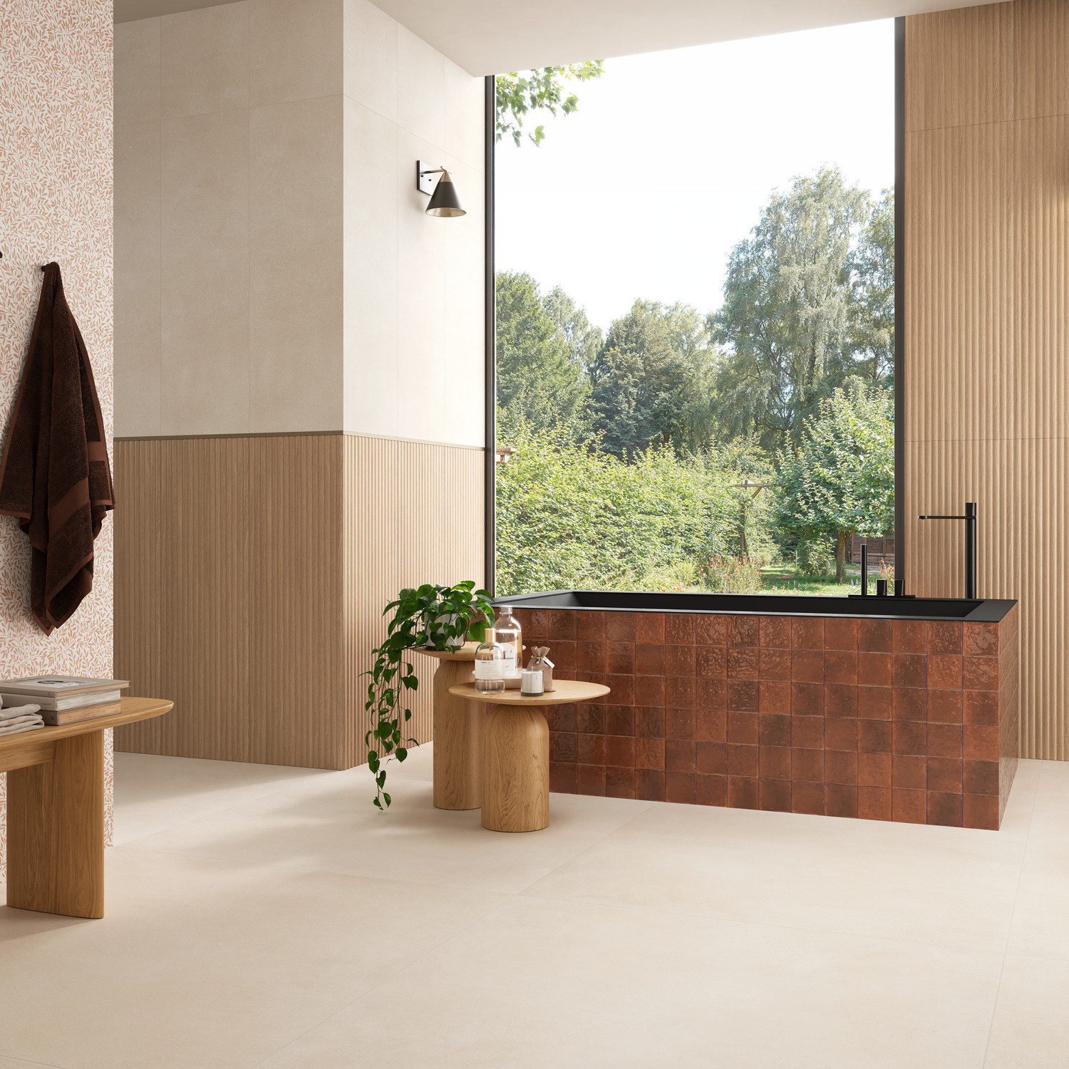 Letos je izrazit poudarek na tridimenzionalnosti. Površine niso več gladke, prevladujejo rebraste, žlebaste in valovite strukture, ki dajejo stenam globino in dinamiko. Svetloba na teh reliefih ustvarja igro senc in poudarkov, zato ploščice postajajo skoraj umetniški element prostora.