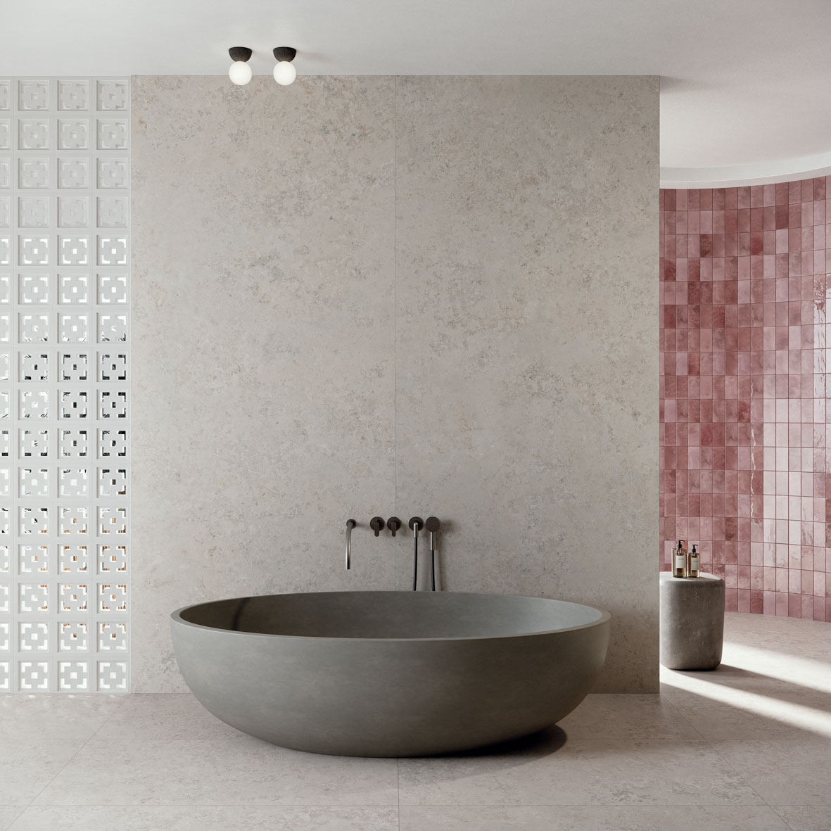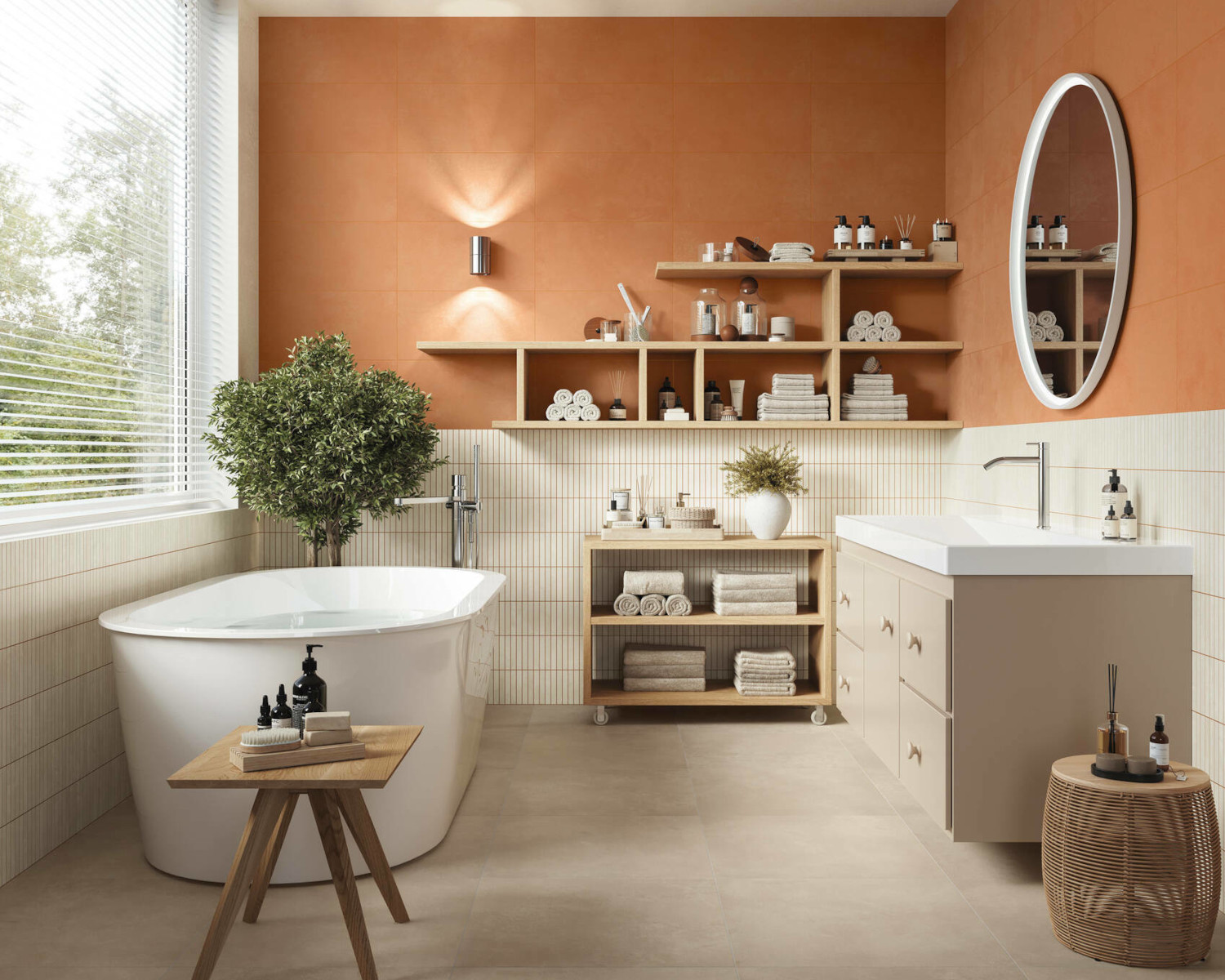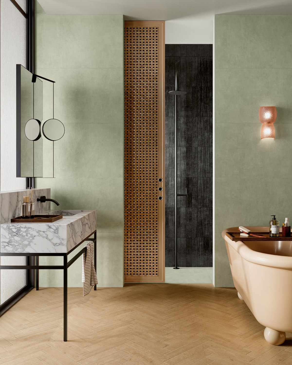 Med formati izstopajo ozki in podolgovati kosi. Od elegantnih “kit-kat” ploščic do večjih modulov, ki omogočajo polaganje tudi na ukrivljenih površinah. Pogosta je kombinacija kontrastov: mat proti sijaju, ravne linije proti mehkim krivuljam, topli toni proti hladnim odtenkom. Materialni učinki, kot so videz lesa, peska, marmorja ali tekstila, se med seboj prepletajo in ustvarjajo harmonično, a hkrati razgibano celoto.