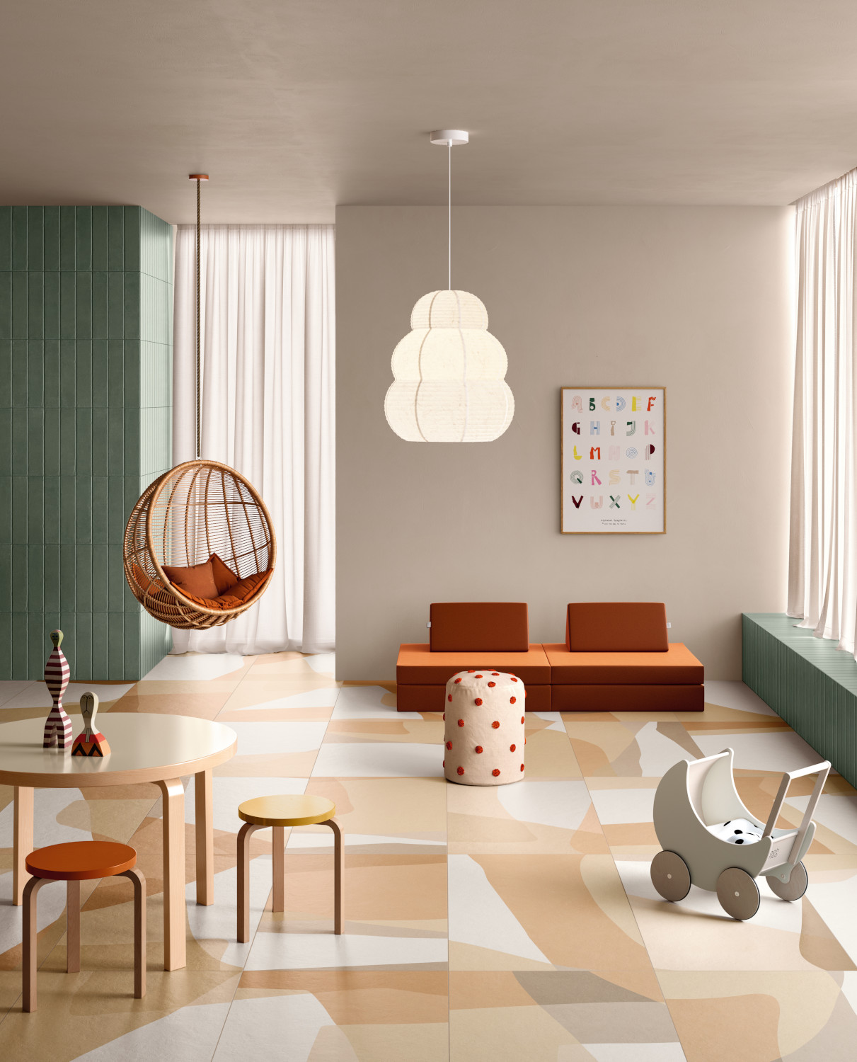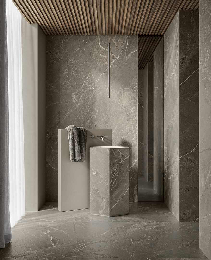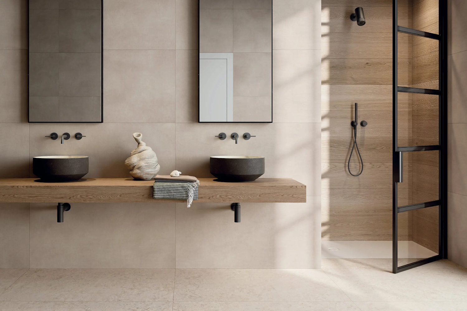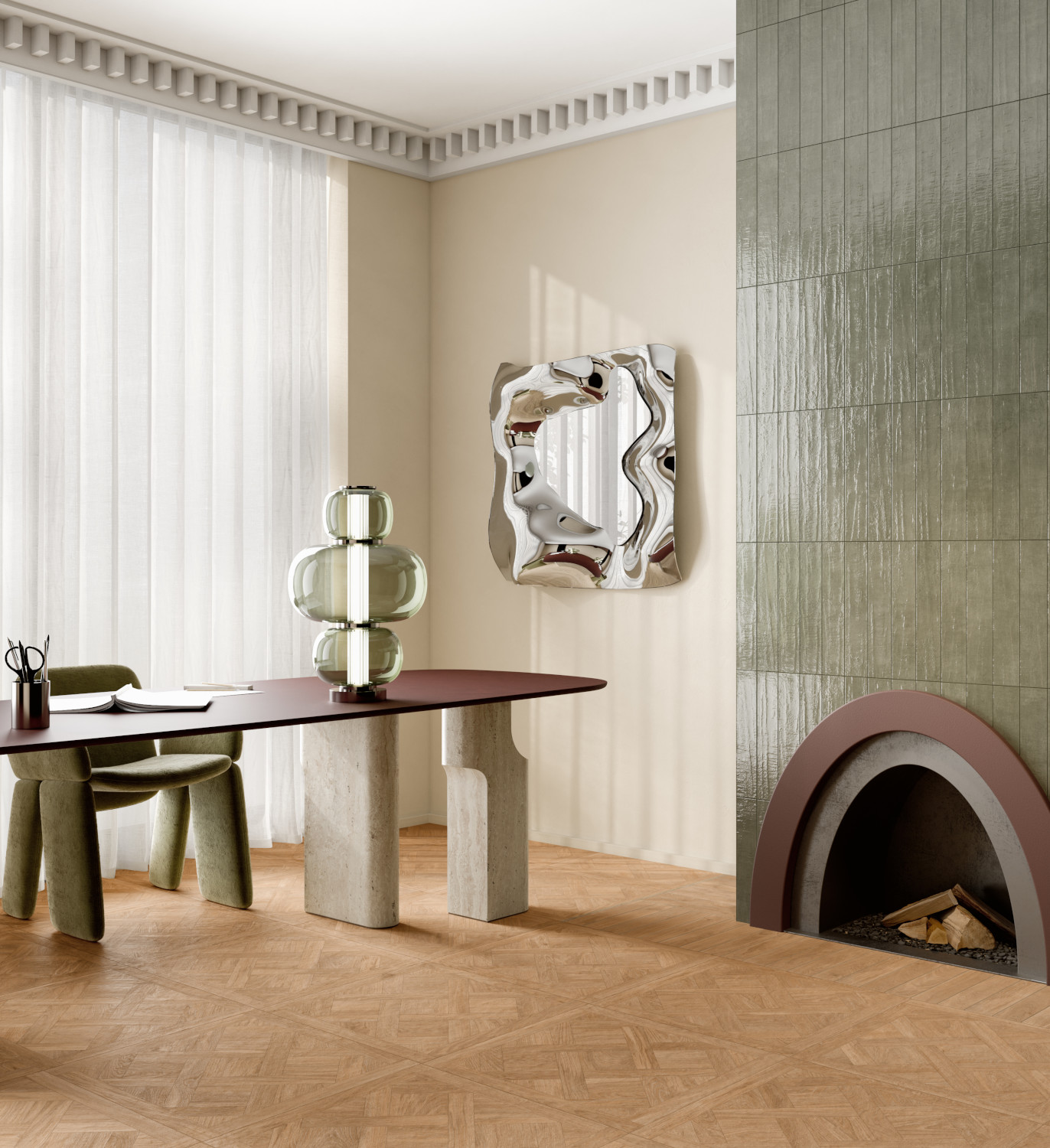 Med formati izstopajo ozki in podolgovati kosi. Od elegantnih “kit-kat” ploščic do večjih modulov, ki omogočajo polaganje tudi na ukrivljenih površinah. Pogosta je kombinacija kontrastov: mat proti sijaju, ravne linije proti mehkim krivuljam, topli toni proti hladnim odtenkom. Materialni učinki, kot so videz lesa, peska, marmorja ali tekstila, se med seboj prepletajo in ustvarjajo harmonično, a hkrati razgibano celoto.