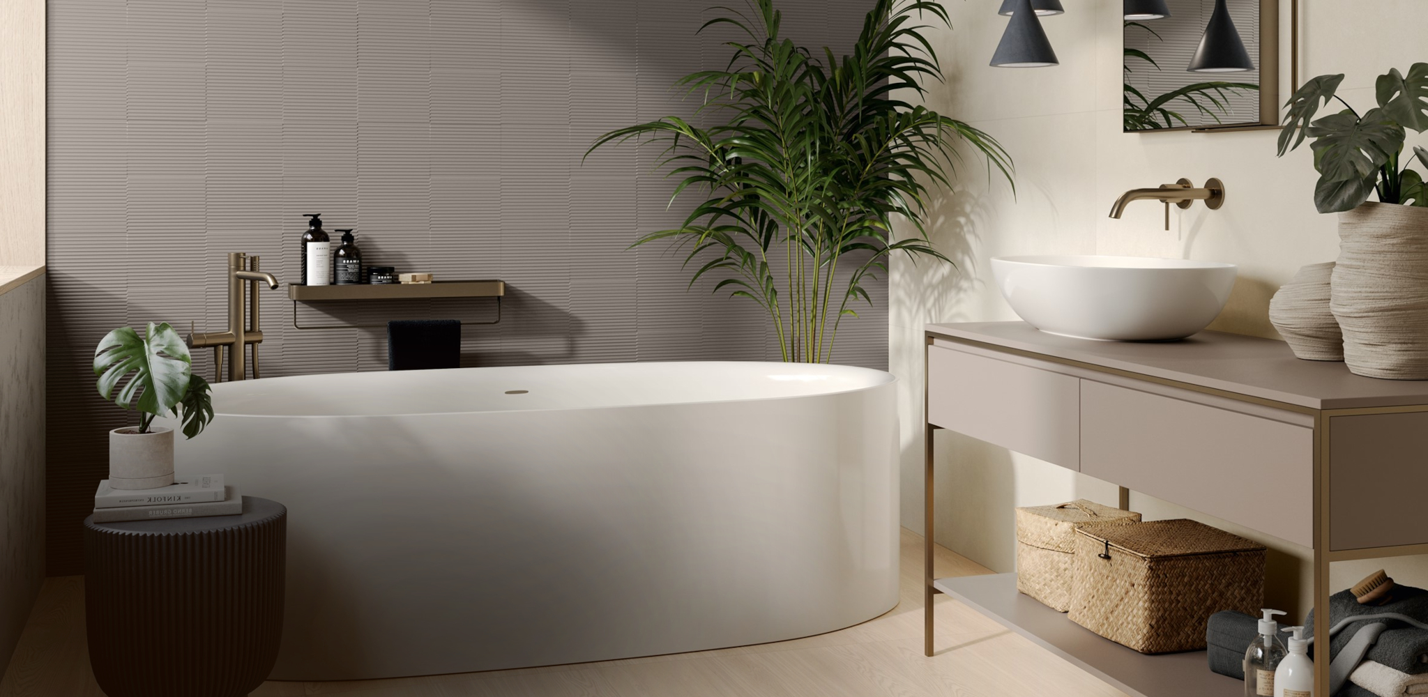 V sodobnih kopalnicah se različni materiali, barve in površinepovezujejo v usklajeno celoto. Novejše kolekcije sanitarne opreme, kopalniškega pohištva in armatur širijo nabor oblikovalskih možnosti ter omogočajo premišljeno, prilagojeno zasnovo prostora.
